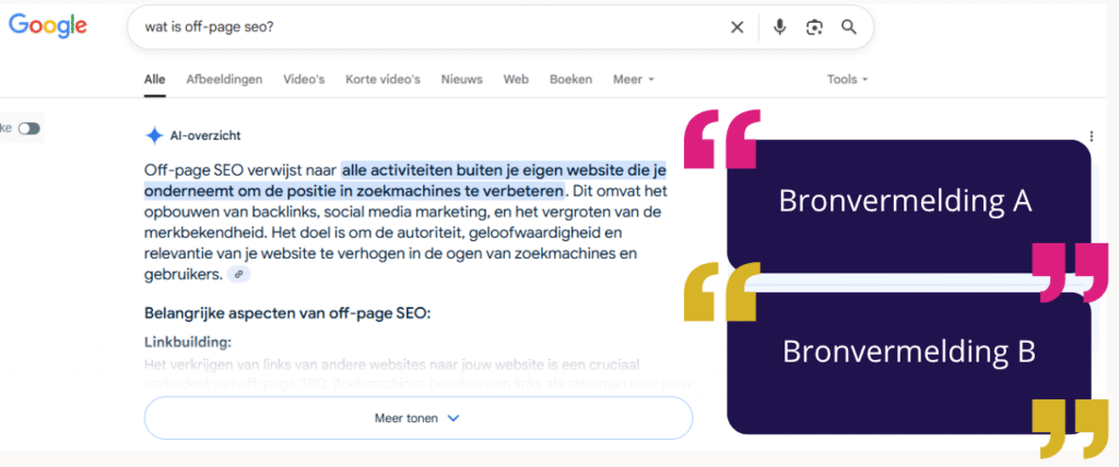 We zien dat websites met een sterk merk, een natuurlijk linkprofiel en veel externe vermeldingen vaker opduiken als bron in dit soort gegenereerde antwoorden. Dat betekent: meer zichtbaarheid, zelfs zonder dat je op plek 1 in Google staat. Dat ziet er dan ongeveer zo uit: